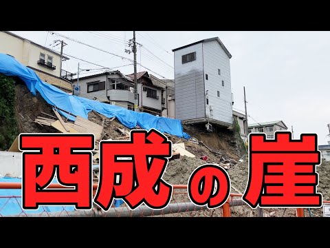 大阪西成の崖の上に建っていた数軒の家が崩れ落ち、奇跡的にギリギリで持ちこたえた家があった。